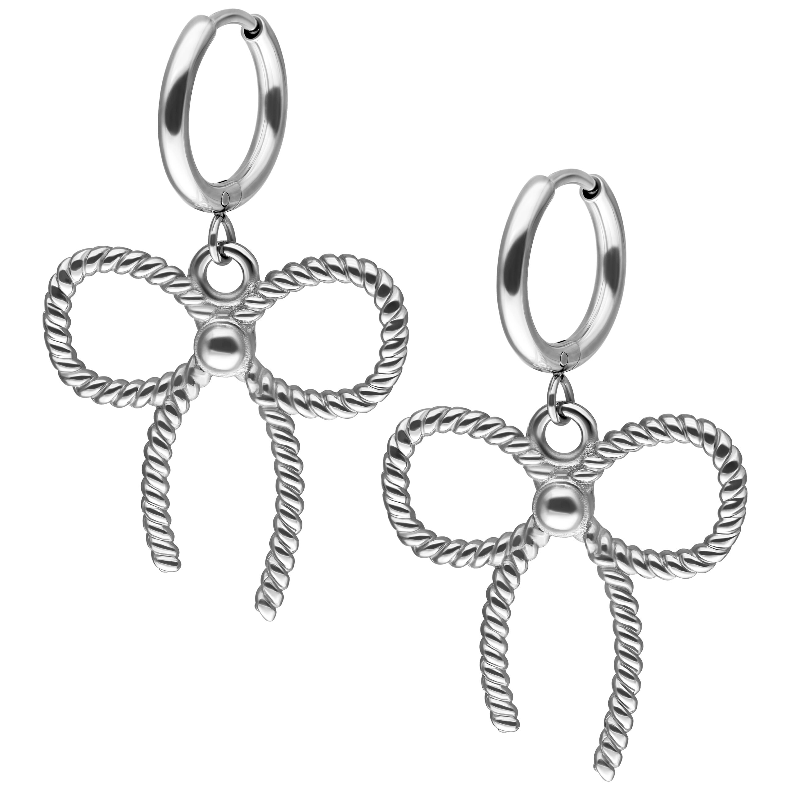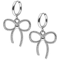 Die dazu passenden Twisted Bow Hoops setzen einen charmanten Akzent: Die kunstvoll gedrehte Schleifenform wirkt modern und verspielt zugleich – ein absoluter Hingucker, der jedem Outfit einen lieblichen Touch verleiht. Die Creolen bestehen ebenfalls aus langlebigem Chirurgenstahl 316L, der für seine Hautfreundlichkeit, Anlaufbeständigkeit und robuste Qualität bekannt ist.