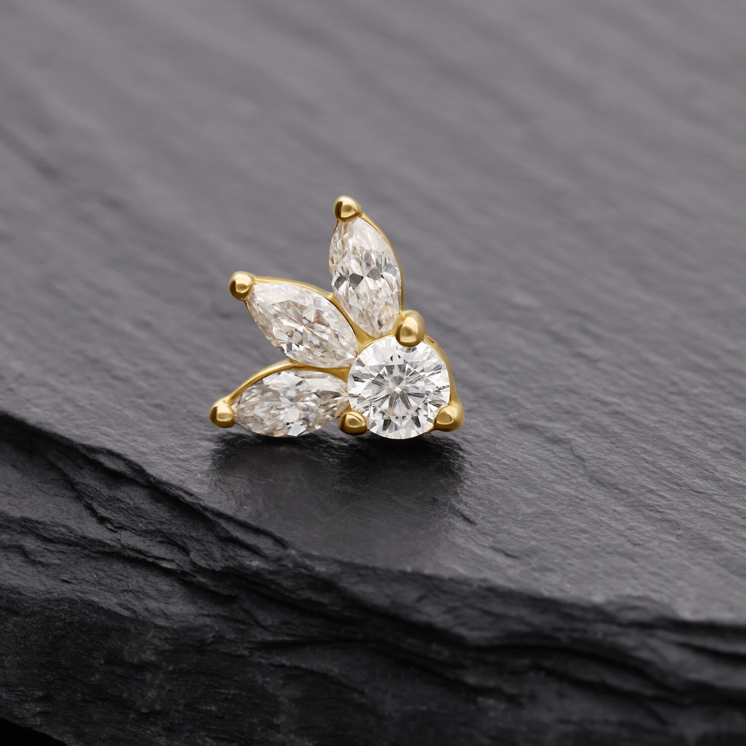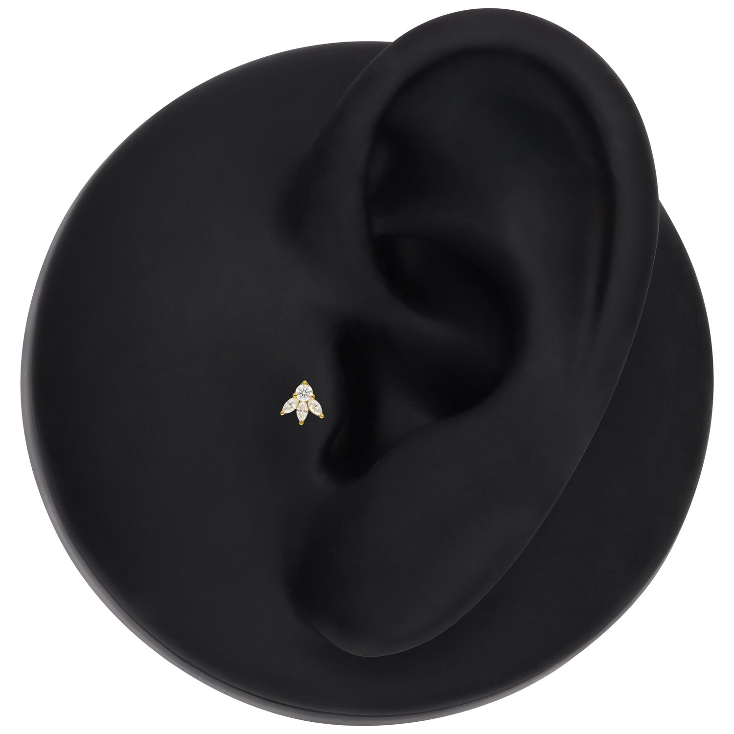 Veredelt mit funkelnden Moissanit-Steinen, strahlt der Aufsatz in außergewöhnlicher Brillanz und verleiht jedem Look eine harmonische, edle Note. Durch die präzise Verarbeitung und die perfekte Passform auf das Perfect Fit Labret (14K) bietet er einen sicheren, hautfreundlichen und komfortablen Sitz – ideal für alle, die luxuriösen Piercingschmuck mit Bedeutung schätzen.