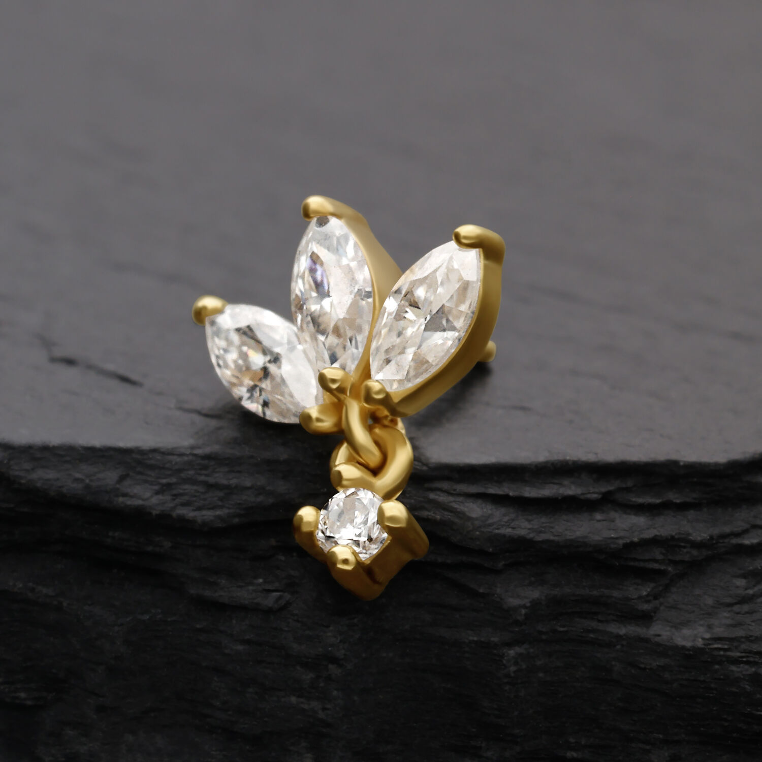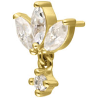 Das 14K Perfect Fit Moissanit Lotus Attachment steht für Balance, Klarheit und luxuriösen Ausdruck. Drei facettierte Moissanit-Steine bilden eine stilisierte Lotusblüte, die durch einen beweglichen Kristallanhänger ergänzt wird – ein Design, das Eleganz und Leichtigkeit vereint.