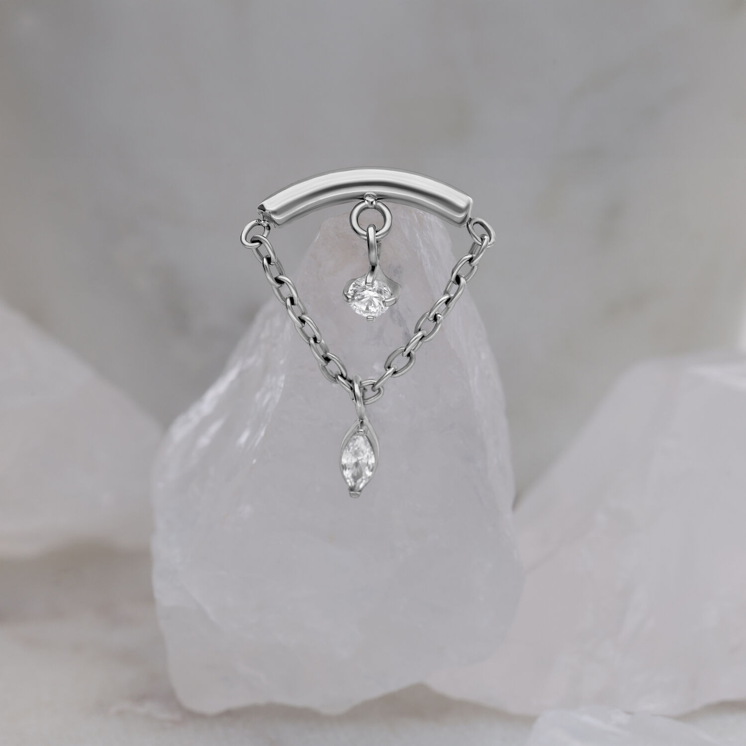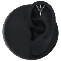 Das Double Jewelled Hidden Helix Push Fit Attachment ist ein edles Helix-Highlight, das sich raffiniert in der Ohrfalte verbirgt. Der geschwungene Aufsatz aus Titan Grad 23 sitzt dezent im Helix-Piercing, während zwei feine Ketten elegant herabfallen und zwei funkelnde Zirkoniasteine perfekt in Szene setzen – ein runder Stein oben und ein marquiseförmiger Kristall unten.