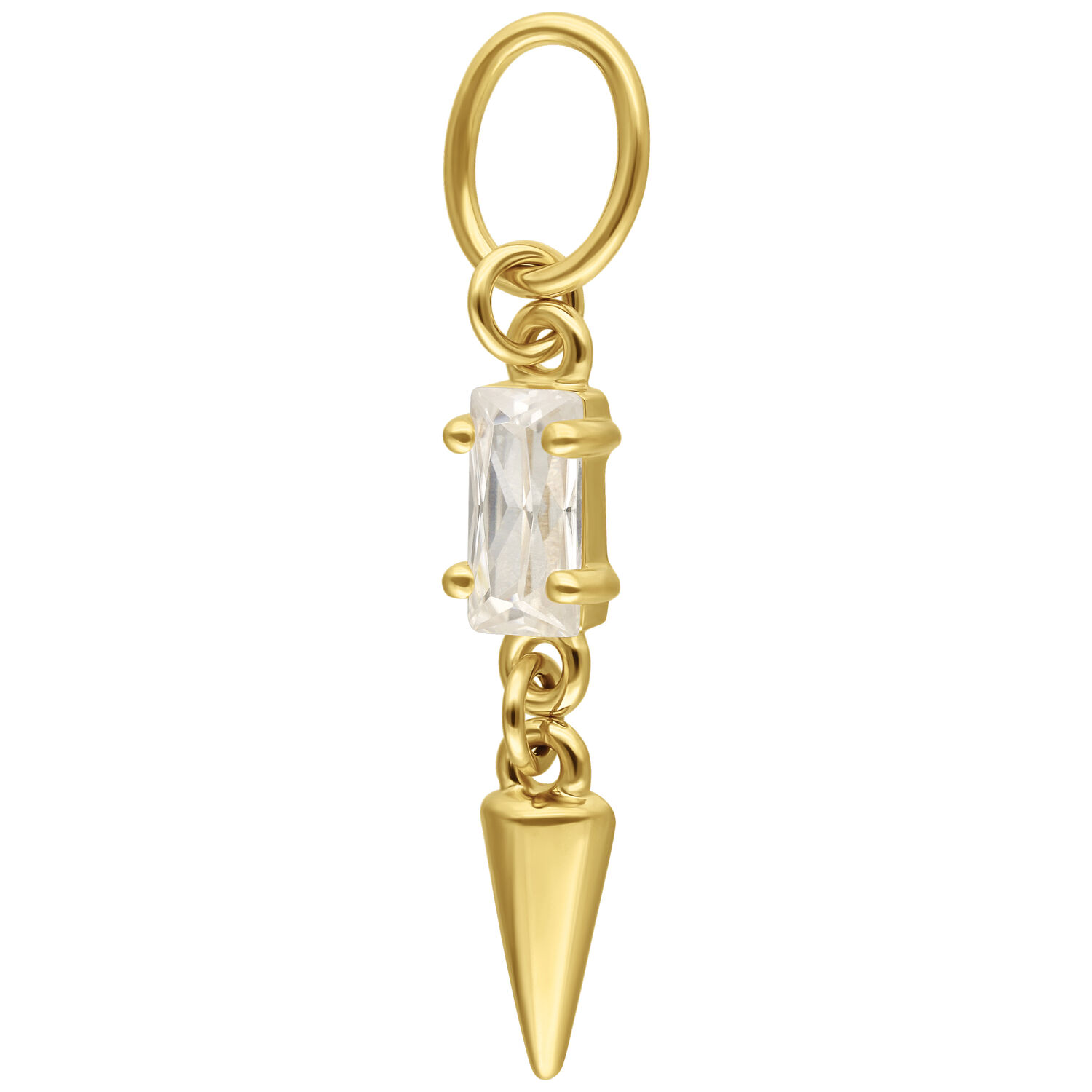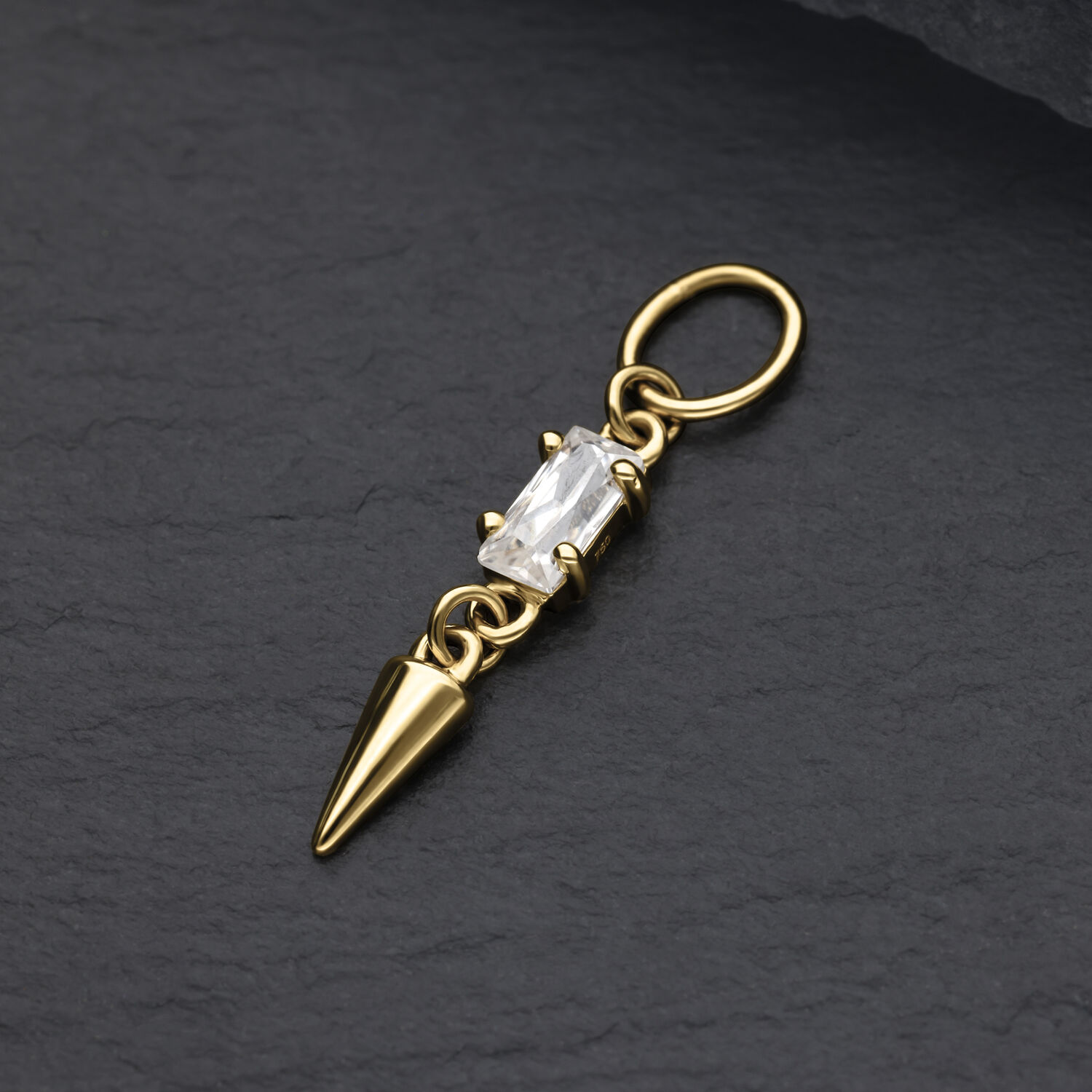 Mit einer Öse von 3,8 x 4,5 mm lässt sich der Anhänger mühelos an Ringen, Creolen oder Clickern befestigen – perfekt, um deinen Look individuell zu gestalten. Der Moissanit sorgt für ein brillantes Funkeln, während der goldene Spike Stärke, Stil und Selbstbewusstsein symbolisiert.
