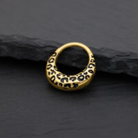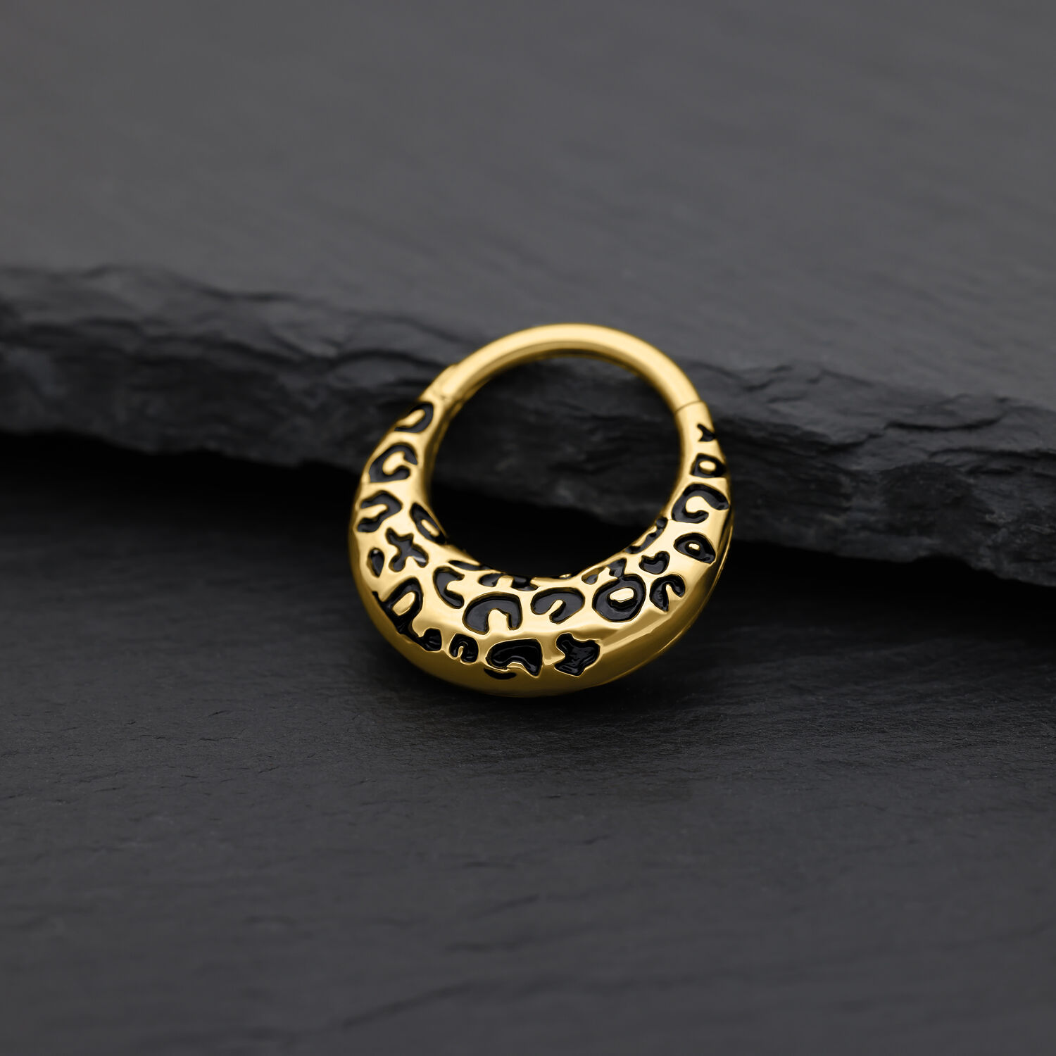 Wild, auffällig und absolut im Trend – der Chunky Leopard Septum Clicker bringt das ikonische Leopardenmuster in eine edle, moderne Form. Das tiefschwarze Emaille-Design in Kombination mit dem goldfarbenen Titan-Finish verleiht deinem Look eine luxuriöse, rebellische Note – ein echtes Statement-Piece für alle, die auffallen wollen.