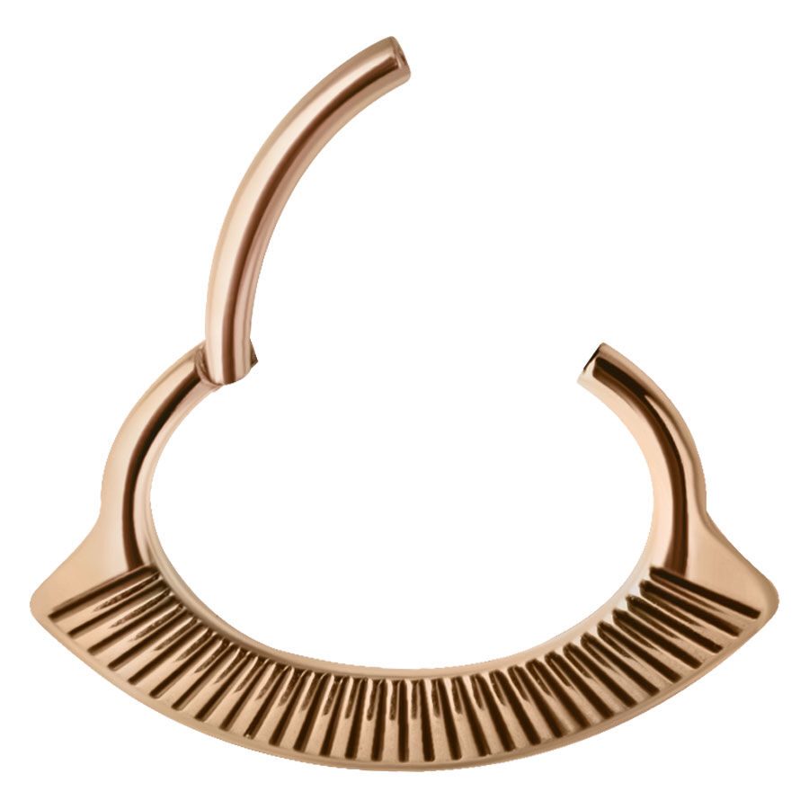 Unser Crest Septum-Piercing besitzt ein einzigartiges Design und ist super geeignet für den Alltag! Es ist aus roséfarbenem Edelstahl hergestellt und bietet aufgrund seines aufklappbaren Verschlusses eine einfache Handhabung beim Einsetzen und Rausnehmen. Das Piercing kann ebenfalls am Ohr oder am Lippenband (Smiley) getragen werden.