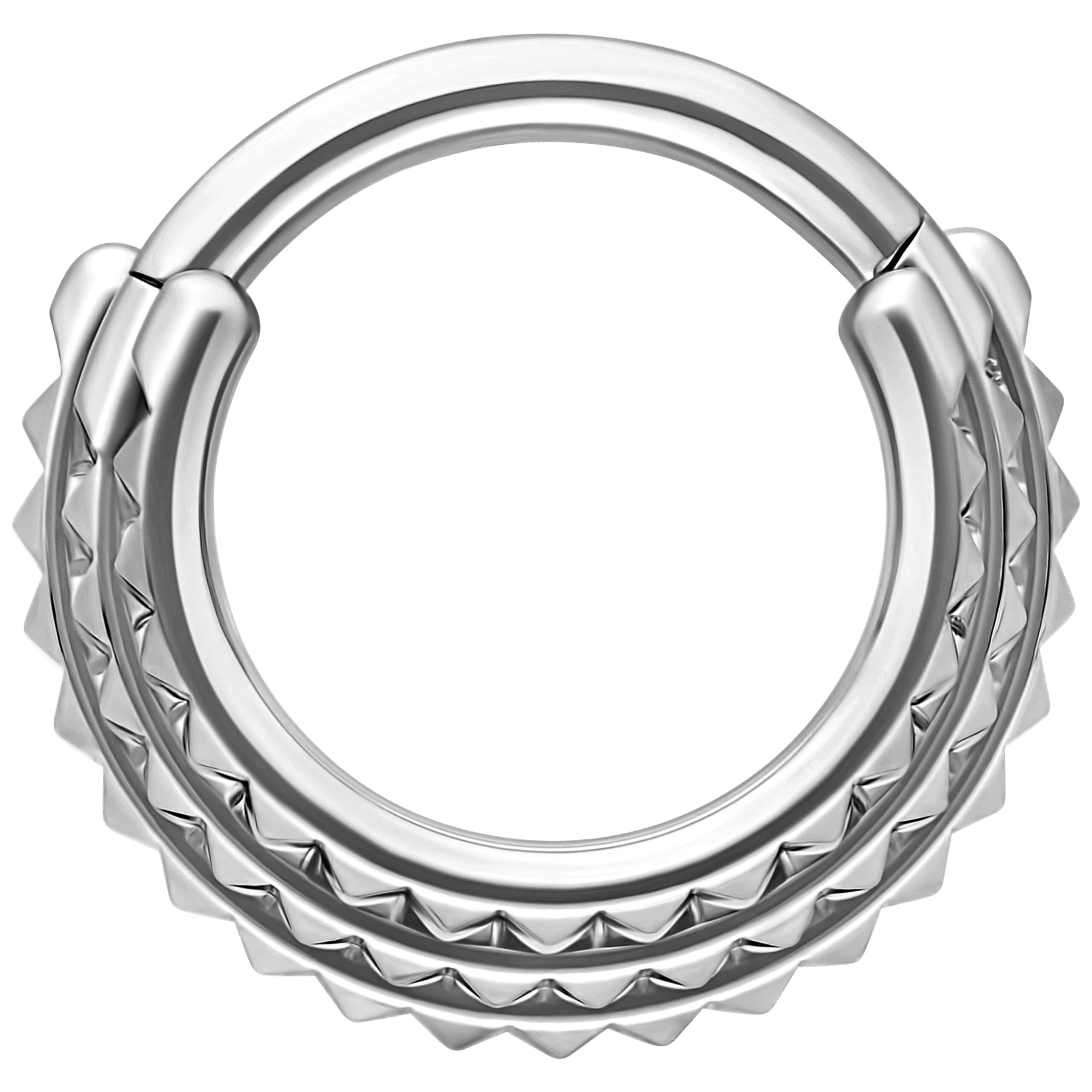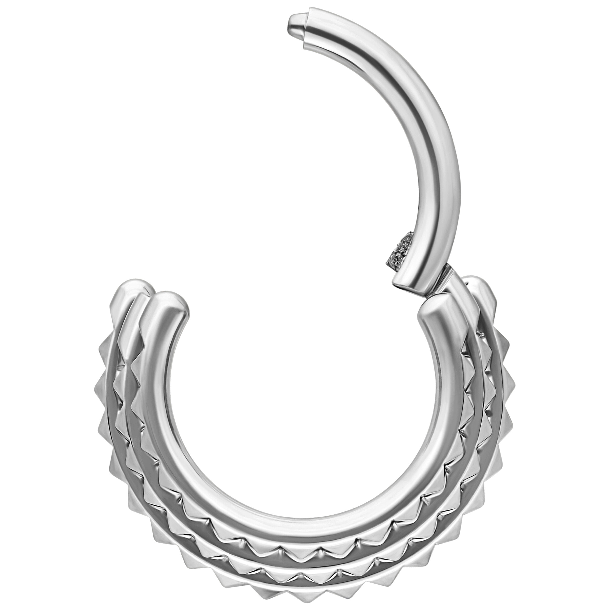Unser Triple Spike Hinged Septum Clicker ist aus hochwertigem Edelstahl hergestellt und ist ideal für Dein Helix, Septum oder auch Daith Piercing geeignet. Das Piercing besitzt einen gebogenen Scharnierstab, welcher Dir eine einfache Handhabung beim Einsetzen des Piercings ermöglicht – und das alles ganz ohne Hilfe.