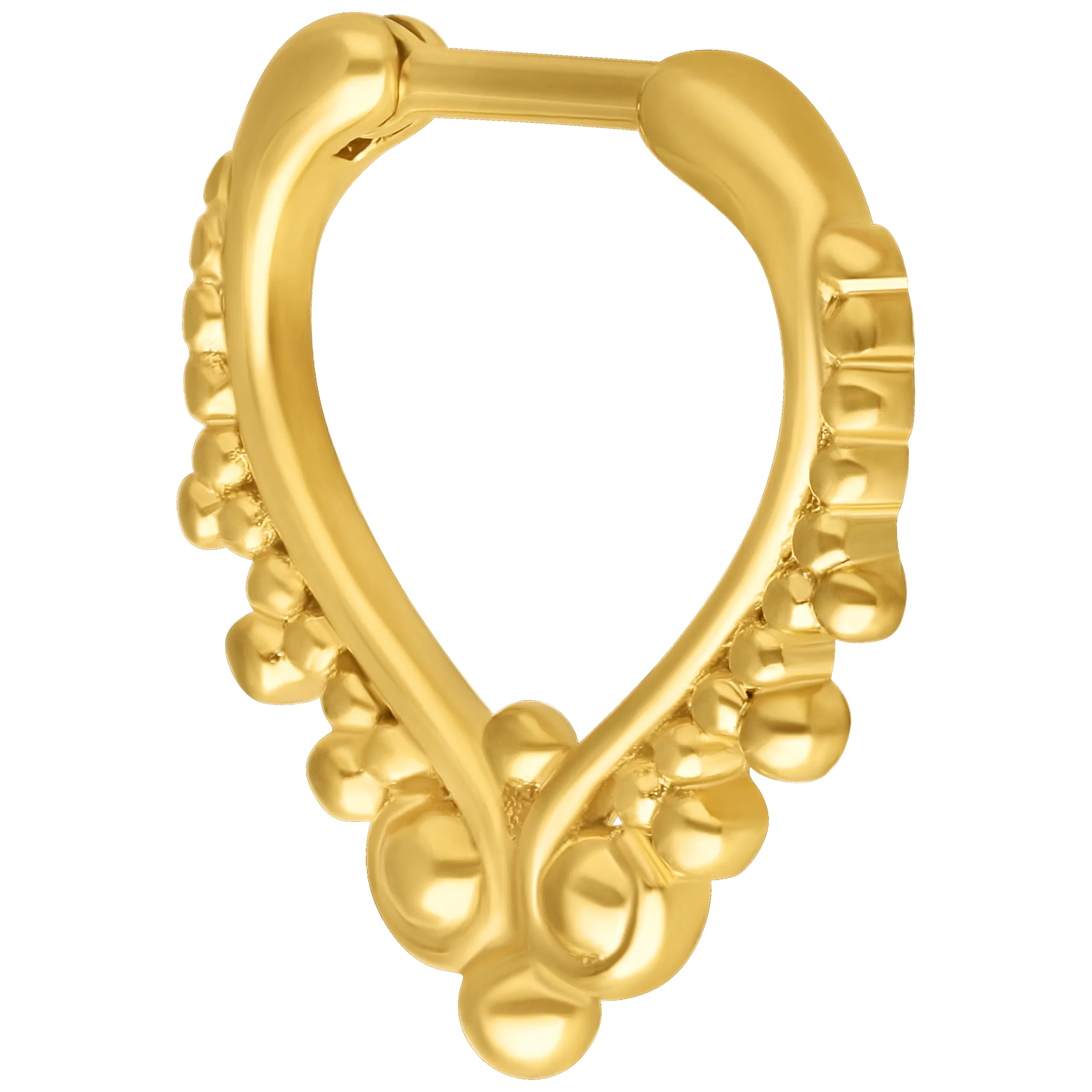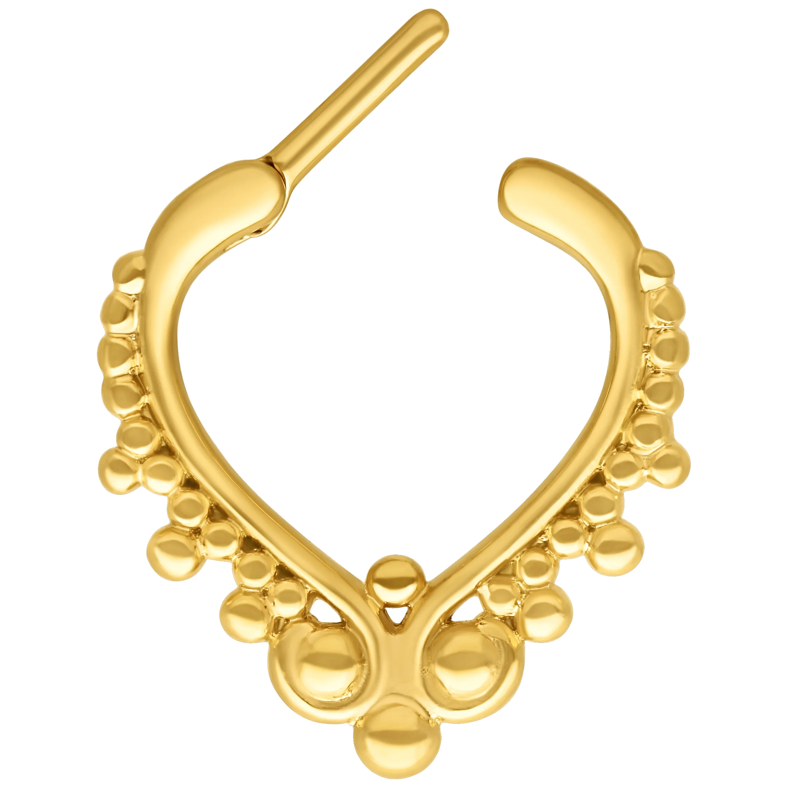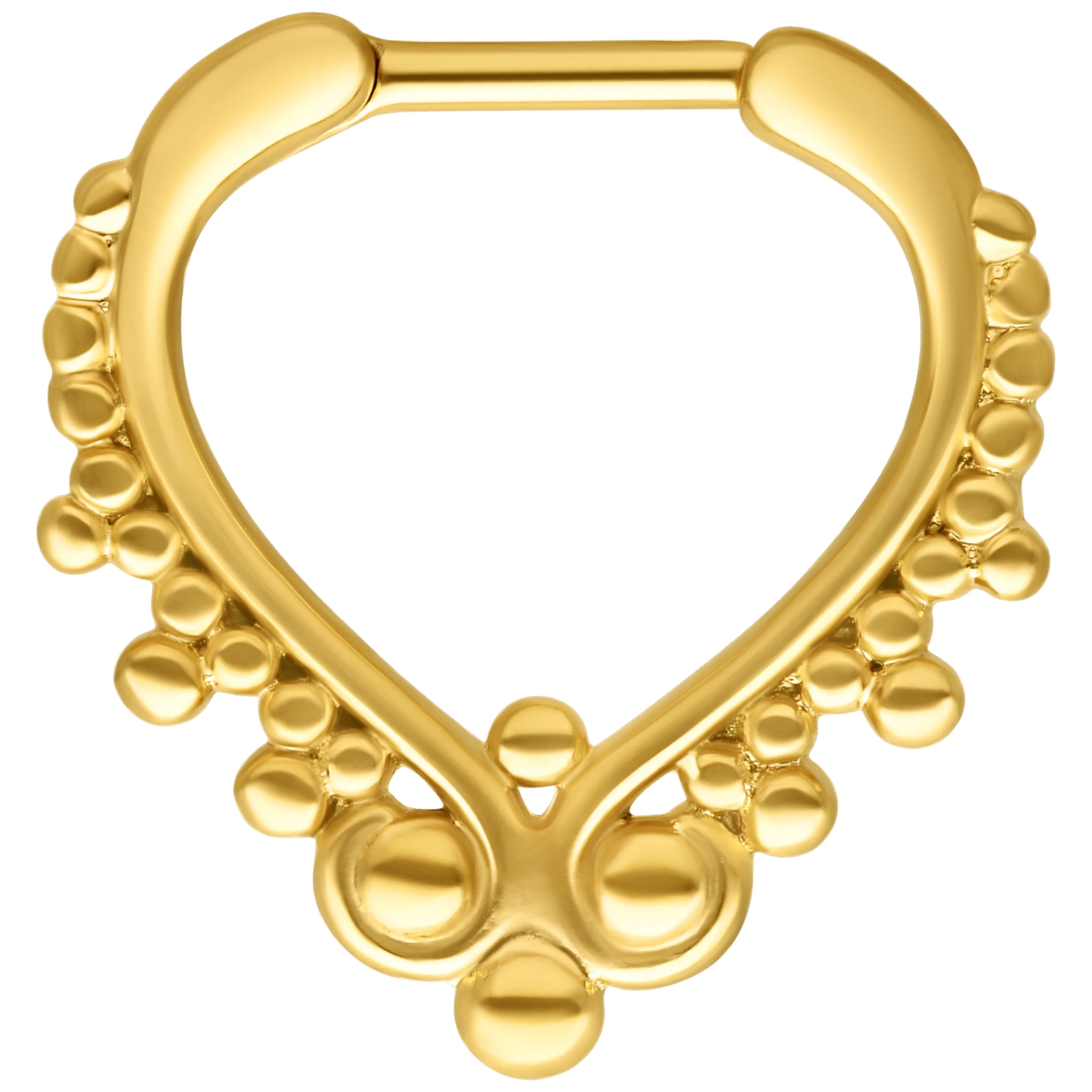 Unser Wonderland Septum Clicker besitzt ein traumhaft schönes und einzigartiges Design. Das Piercing hat einen kleinen Hauch vom Orient, und dazu macht die goldene Farbe ihn zum absoluten Hingucker! Das Septum-Piercing besitzt einen geraden Scharnier-Stahlsteg aus Edelstahl mit einer Länge von ca. 6.0 mm. Durch seinen Klick-Verschluss ist das Piercing super leicht zu öffnen und einzusetzen. Alternativ kann das Piercing auch zum Beispiel für dein Daith Piercing verwendet werden.