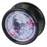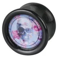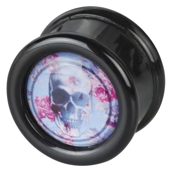 Der schicke PMMA Plug mit Totenkopfmotiv und Rosen im Hintergrund wertet garantiert jedes Deiner Outfits auf.
