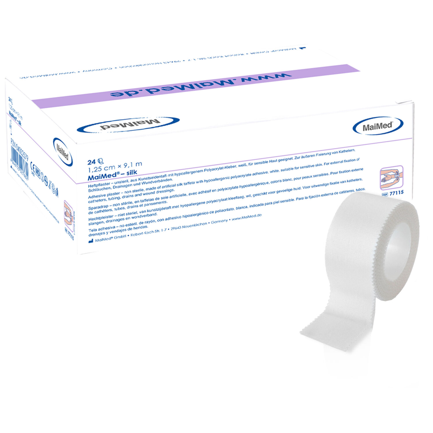 MaiMed® silk RollenpflasterZur Fixierung von Kompressen, Binden, Wundverbänden und vielem mehr.- Kunstseidenfaden mit Polyacrylat-Kleber- längs und quer reißbar- haut-freundlich und hypoallergen- auf Kunststoffkern gewickelt- Latex freiMaße: 1,25cm x 9,1m Inhalt: 24 Stück pro Box