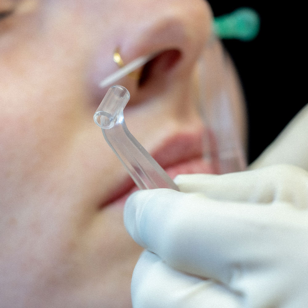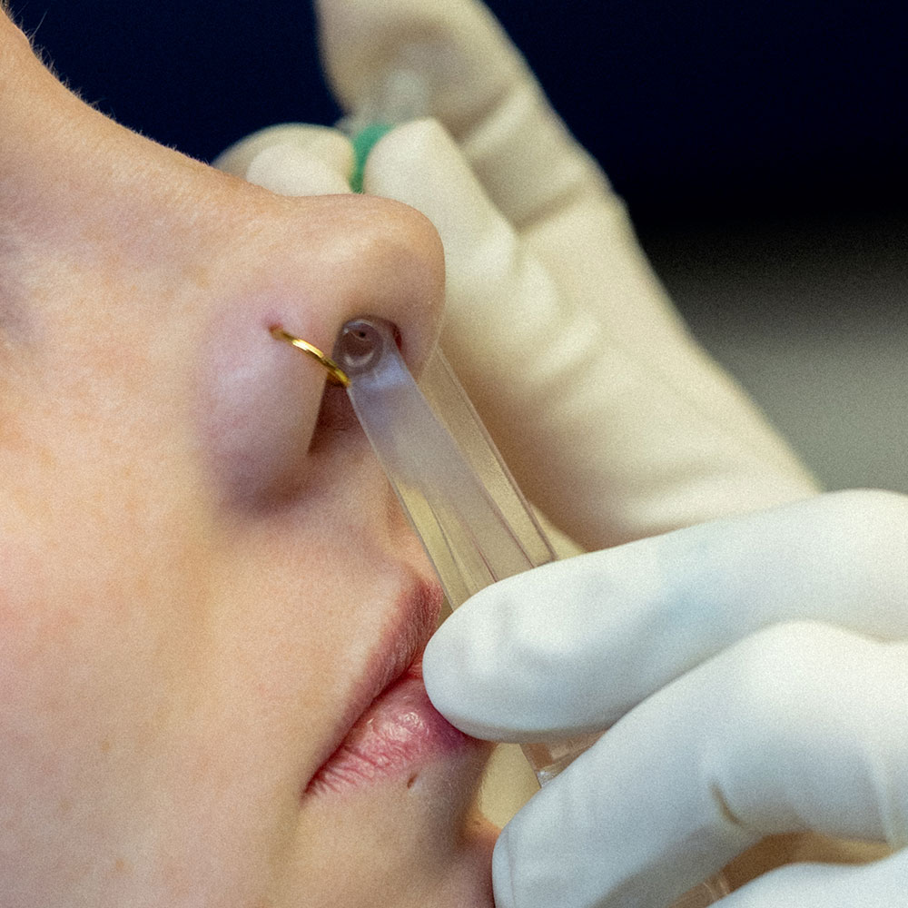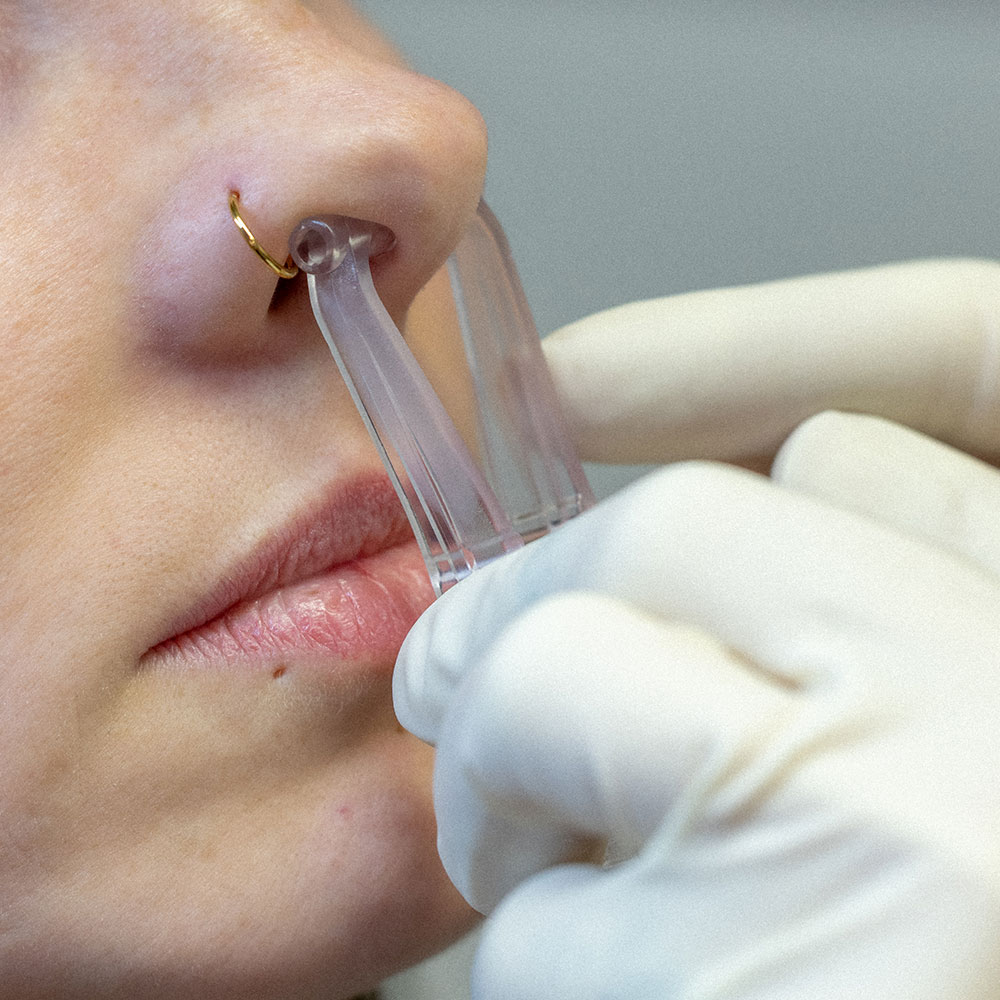 Kanal der Septumzange am “Sweetspot” platzieren und mit einer Hand fixieren.